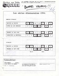 Pour la saison 1993-1994, sa troisième année de publication, Hockey sur Table Hebdo présentait un total de 35 numéros et un numéro "0" présenté en début de saison qui reprenait le dernier numéro de la saison précédente. Le journal de statistiques qu'était - et qui demeure d'être - HTH continuait de se transformer, devenant un journal beaucoup plus complet avec un vaste inventaire d'éditoriaux. en plus avec l'arrivée des Stef's Comic Strip Band, Bourreau du Donjon, Kill And Destroy et la Ligue en Action, Hockey sur Table Hebdo profitait alors d'une popularité presqu'aussi grande que Jésus lui-même! Le meilleur est encore à venir?